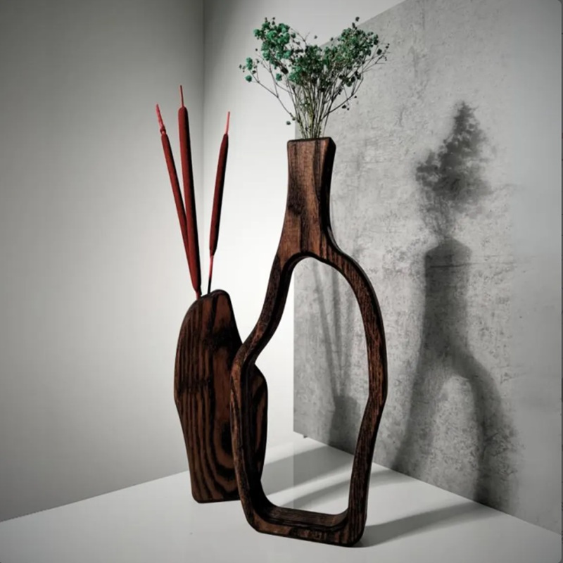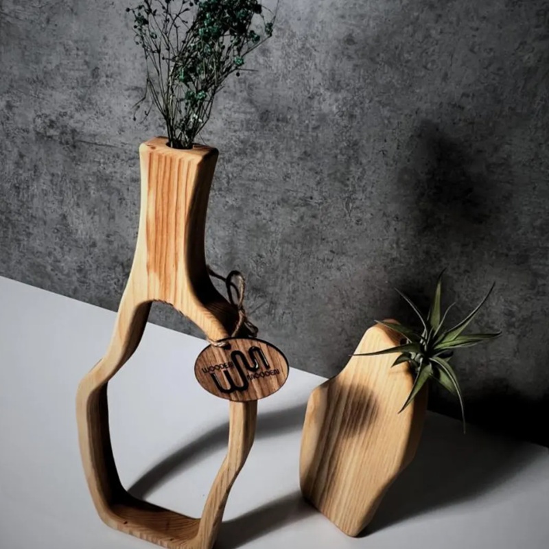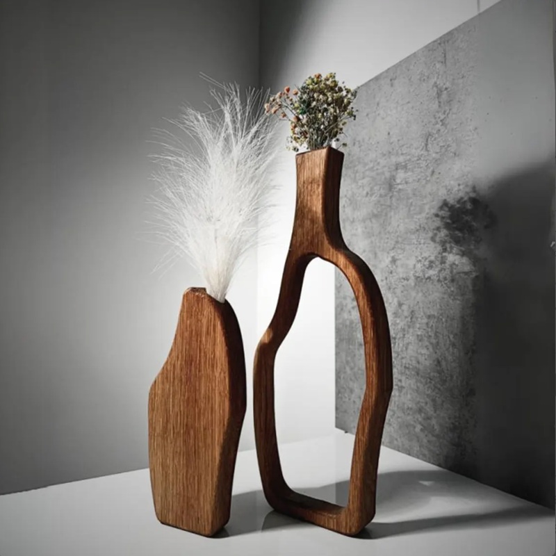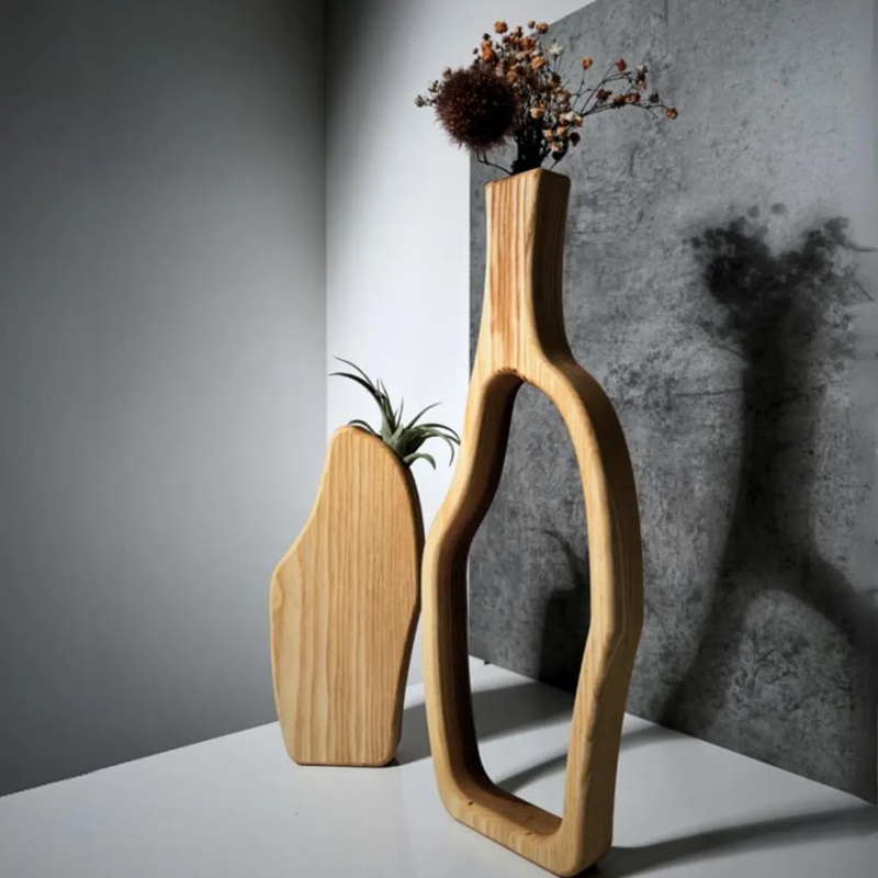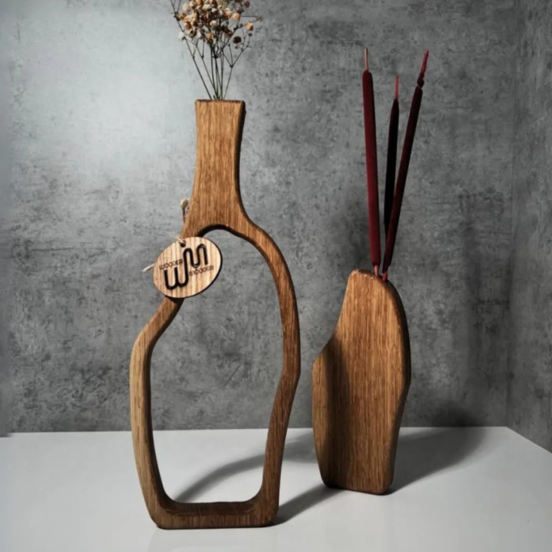 This handcrafted hollowed wooden vase set combines natural hardwood texture with modern cutout designs . Each piece is uniquely carved (no duplicates) and be able to marked with a customized tag, suitable for living rooms, studios or entryways.