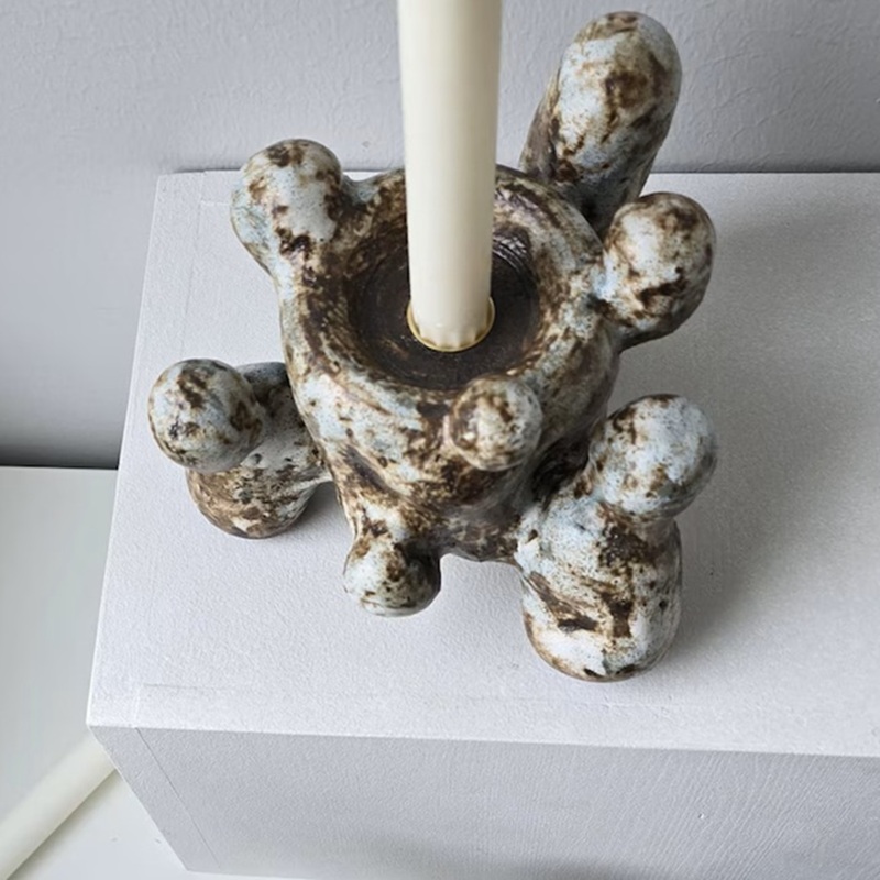 This candle holder is handmade from stoneware clay, finished with a moon textured glaze, The forms are intentionally asymmetrical.