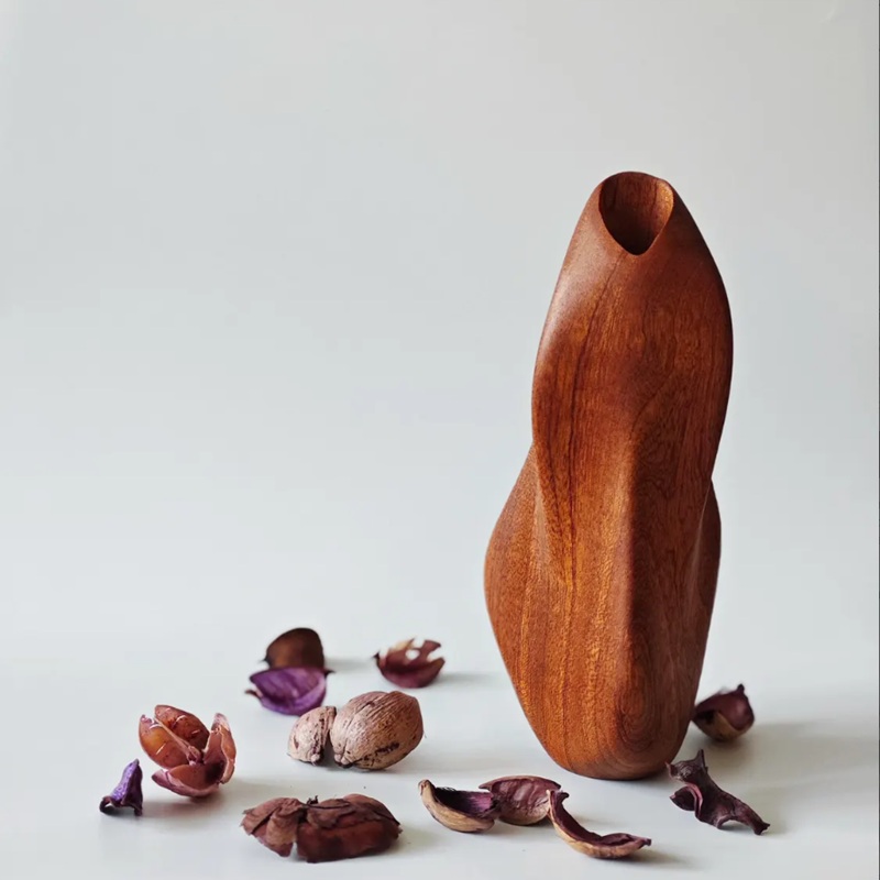 Le vase en bois est fabriqué à partir de bois de noyer rouge, présentant une texture naturelle, tandis qu'une partie du vase adopte une finition de peinture noire pour créer un effet de contraste de couleur, insufflant une vitalité naturelle et une atmosphère artistique à l'espace.