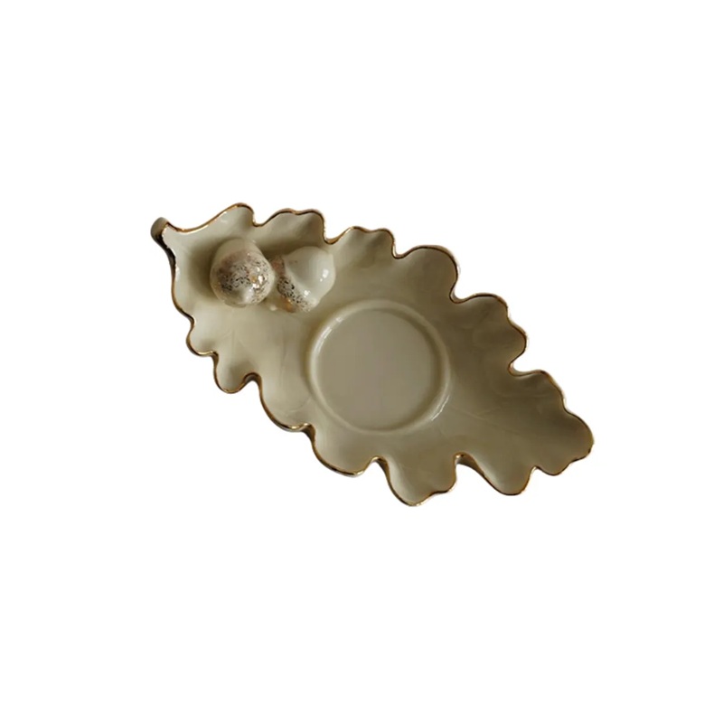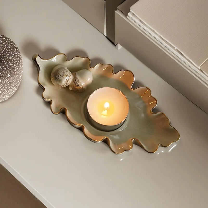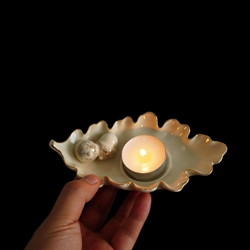 Light Luxury Leaf-Shaped Ceramic Tealight Holder with Lit Candle and Acorn Decoration