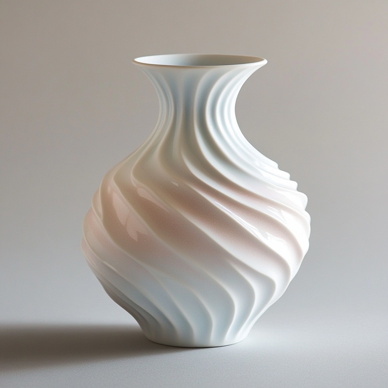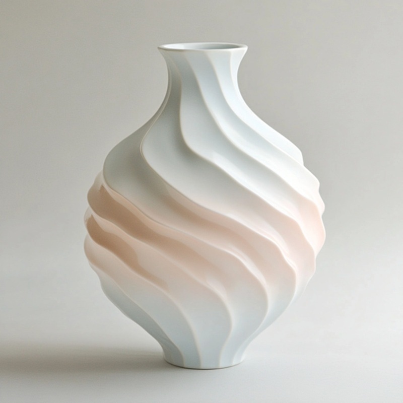 - ConceptionTexture 3D ondulée + dégradé de couleurs pastel (transition bleu-rose-blanc) ; col étroit + corps bulbeux + bord festonné, équilibrant élégance et intérêt visuel.
